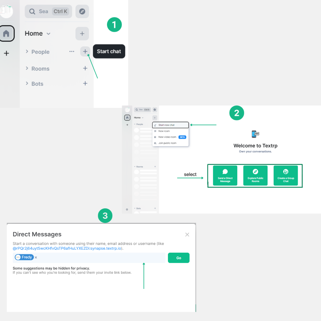 * Choose “Direct Message” for a private conversation or “Room” for a group chat.